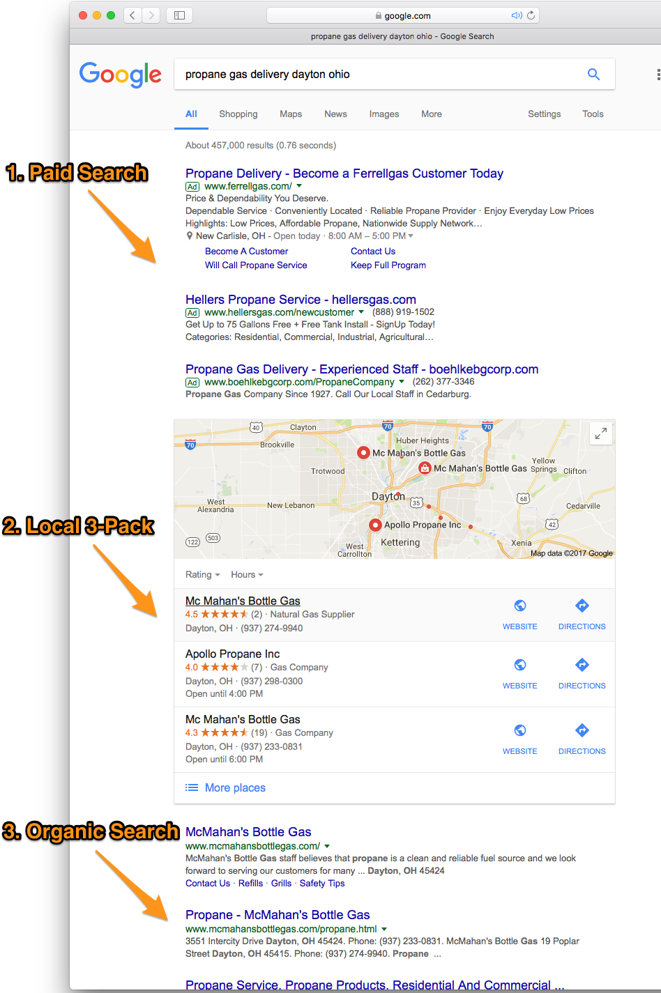 You want your website to show up in 3 places: Paid Search, the Local 3-Pack, and Organic Search.