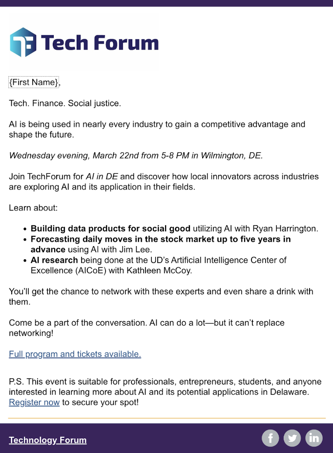 When promoting events for our client, TechForum, we had an effective marketing formula defined: an Eventbrite page + weekly emails + social media posts.