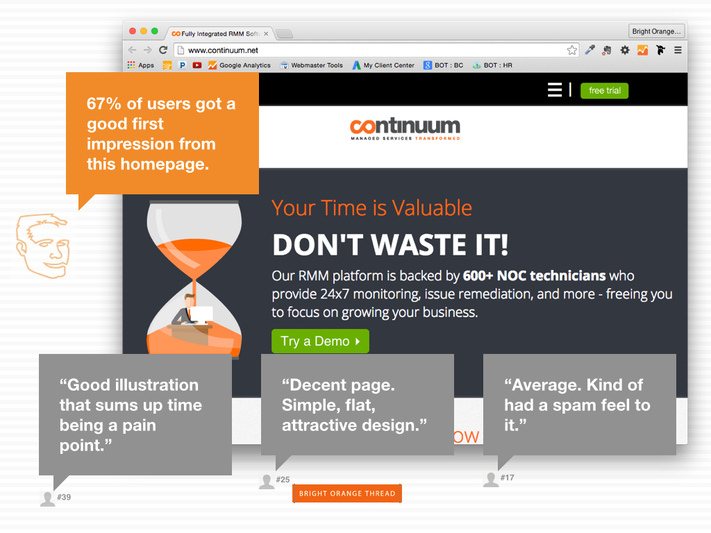 - Bright Orange Thread runs the test where we collect 60 responses form 20 real users about their first impression of our homepage.